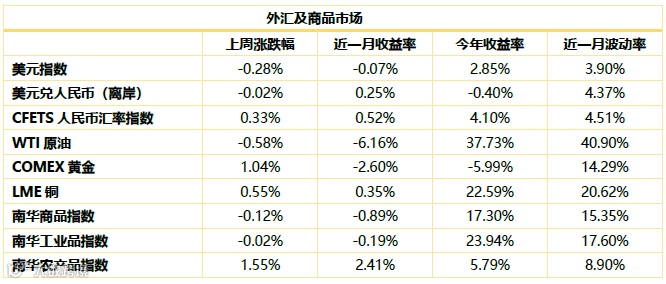 商品市场综述:上周商品市场涨跌分化。南华商品指数下跌0.12%,南华工业品指数下跌0.02%,南华农产品指数上涨1.55%。WTI原油继续下跌0.58%,COMEX黄金上涨1.04 %,LME铜上涨0.55%。