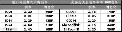 本周资金面收紧,资金利率出现明显上行。R001加权收报2.20%,R007加权收报2.21%;GC001收报2.15%,GC007收报2.26%。