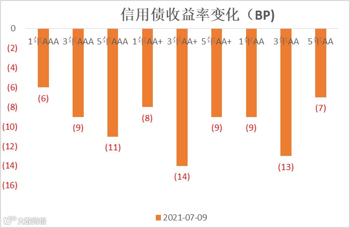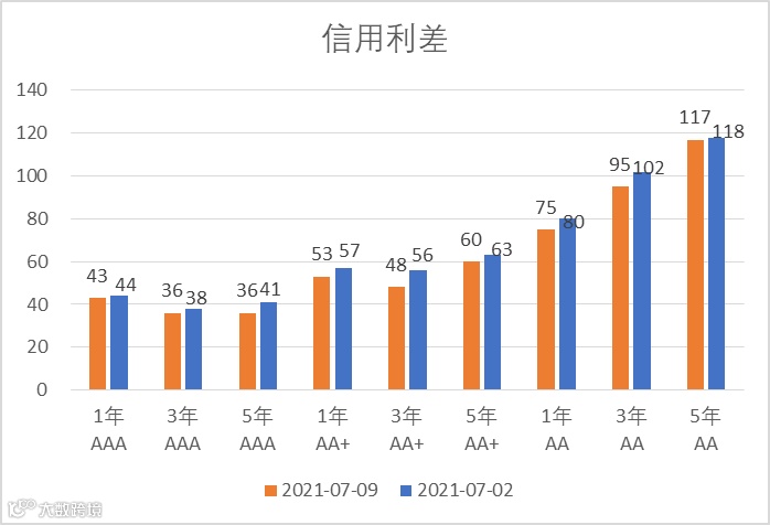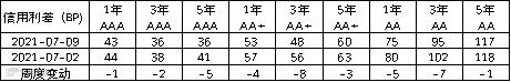 信用利差方面,各等级信用利差有所收窄,其中 3 年期 AA+和 AA 等级信用利差收窄 7~8bp。