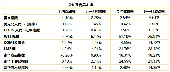 商品市场综述:上周商品市场呈震荡状态。南华商品指数下跌0.26%,南华工业品指数上涨0.43%,南华农产品指数下跌0.60%。WTI原油下跌0.70%,COMEX黄金上涨1.42%,LME铜上涨1.24%。