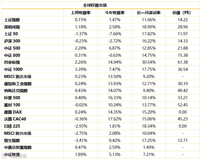 全球市场观察。上周全球主要经济体股市涨跌不一,美国纳斯达克上涨0.43%,标普500上涨0.40%。德国DAX上涨0.24%、法国CAC40下跌0.36%,富时100下跌0.02%。亚洲市场,日本日经225指下跌2.93%,香港恒生指数下跌3.41%。