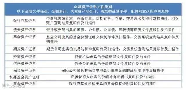 注:金融资产证明主要就是存款和股债基等各种金融投资产品的证明,各项证明文件任选其一即可。