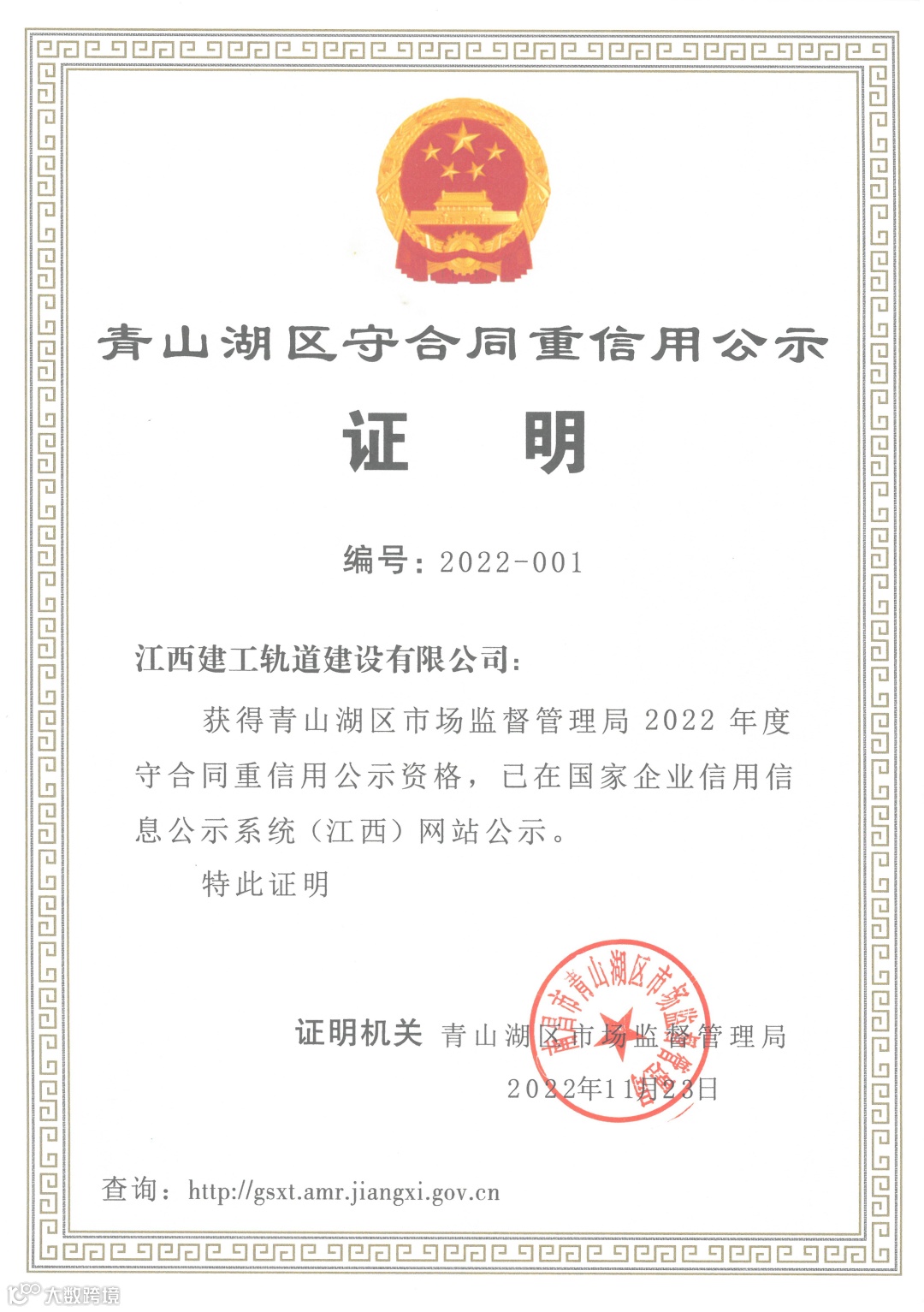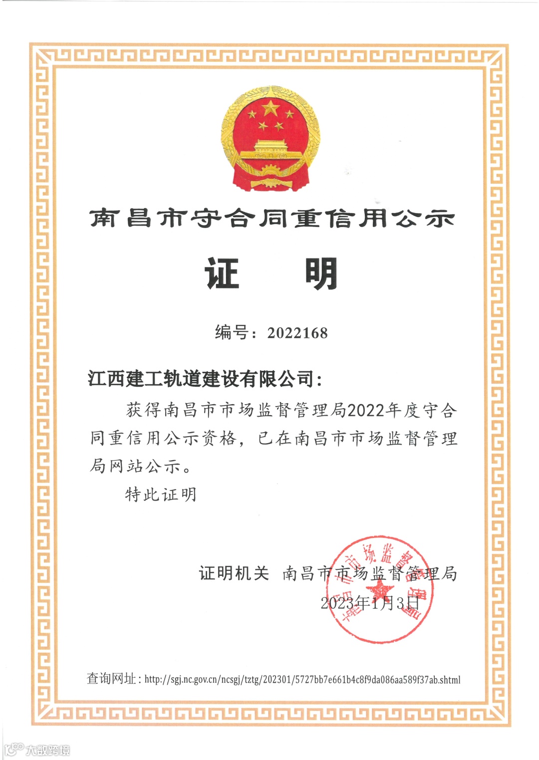 近日公司分别获得由南昌市市场监督管理局颁发的2022年度南昌市守合同重信用公示证明和青山湖区市场监督管理局颁发的2022年度青山湖区守合同重信用公示证明,并在南昌市市场监督管理局官方网站公示。