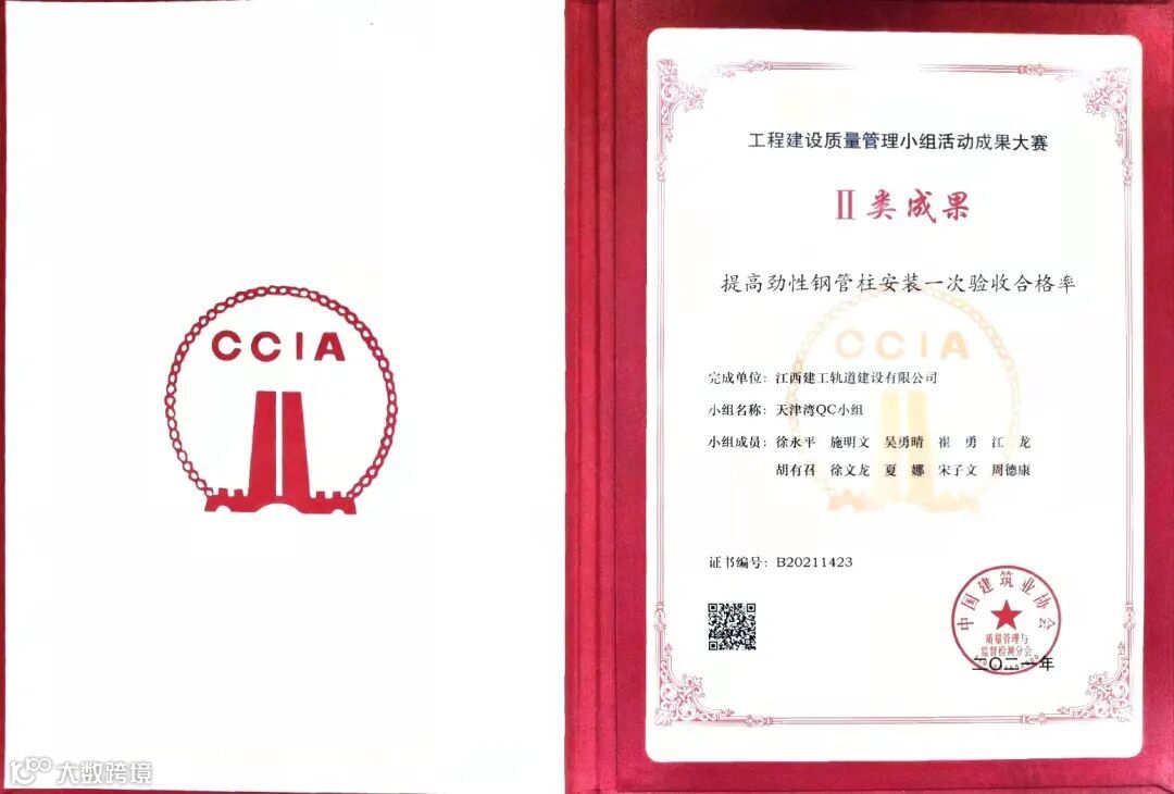 近日,从中国建筑业协会传来喜讯,江西建工轨道建设有限公司天津湾QC小组选送的《提高劲性钢管柱安装一次验收合格率》课题,荣获中国建筑业协会工程建设质量管理小组活动成果大赛Ⅱ类成果奖。