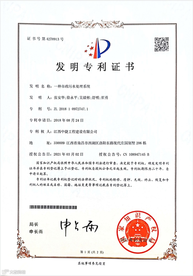 导读:近日,公司申报的发明专利“一种市政污水处理系统”获国家知识产权局授权。