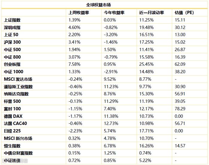 全球市场观察。上周全球主要经济体股市普遍呈窄幅震荡状态,美国纳斯达克下跌0.25%,标普500下跌0.13%。德国DAX下跌1.17%、法国CAC40下跌0.46%,富时100下跌1.15%。亚洲市场,日本日经225指下跌2.23%,香港恒生指数上涨0.38%。