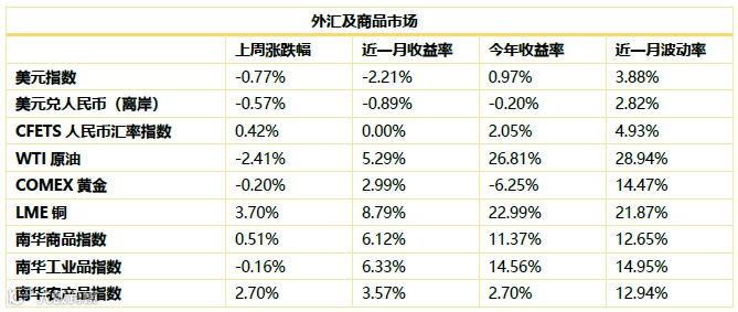 商品市场综述:商品市场上周较为分化。南华商品指数上涨0.51%,南华工业品指数下跌0.16%,南华农产品指数上涨2.70%。WTI原油下跌2.41%,COMEX黄金下跌0.20%,LME铜上涨3.70%。