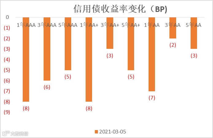 上周信用债二级收益率小幅下行,信用利差小幅收窄。中票收益率整体下行,3年期AAA、AA+和AA等级中票下行3-6bp。