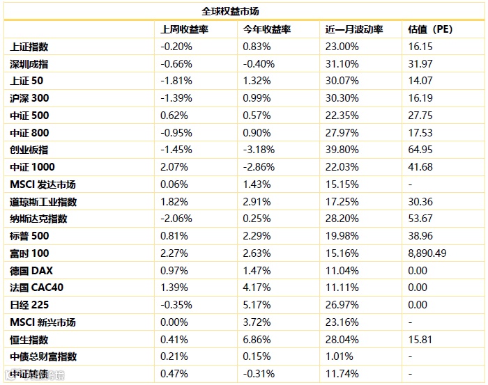 全球市场观察。上周全球主要经济体股市主要处于震荡状态,美国纳斯达克下跌2.06%,标普500上涨0.81%。德国DAX上涨0.87%、法国CAC40上涨1.39%,富时100上涨2.27 %。亚洲市场,日本日经225指数下跌0.35%,香港恒生指数上涨0.41%。