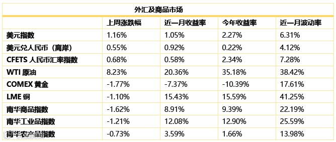 商品市场综述:商品市场上周止涨补跌。南华商品指数下跌1.62%,南华工业品指数下跌1.21%,南华农产品指数下跌0.73%。WTI原油上涨8.23%,COMEX黄金下跌1.77%,LME铜下跌1.10%。
