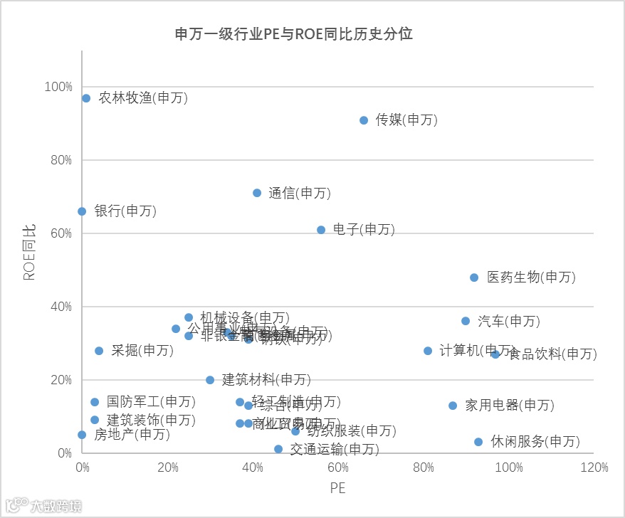 行业PE与ROE同比在2015年以来历史分位对比分析,房地产、银行、农林牧渔、国防军工以及采掘等行业在相同历史估值分位下ROE增速处于历史高位。
