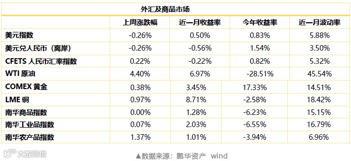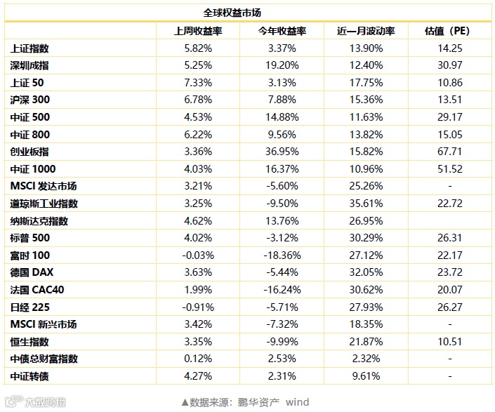 全球市场观察。全球主要经济体股市大部分上涨,美国纳斯达克、标普500分别上涨了4.62%、4.02%。欧洲主要股市大部分上涨,其中德国DAX、法国CAC40分别上涨了3.63%、1.99%,富士100表现持平。亚洲市场,日本日经225指数下跌了0.91%,香港恒生指数上涨了3.35%。