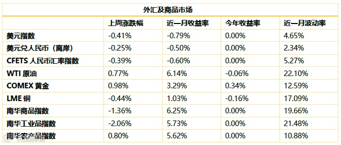 商品市场综述:商品市场上周主要呈下跌趋势。南华商品指数下跌1.36%,南华工业品指数下跌2.06%,南华农产品指数下跌0.80%。WTI原油上涨0.77%,COMEX黄金上涨0.98%,LME铜下跌0.44%。