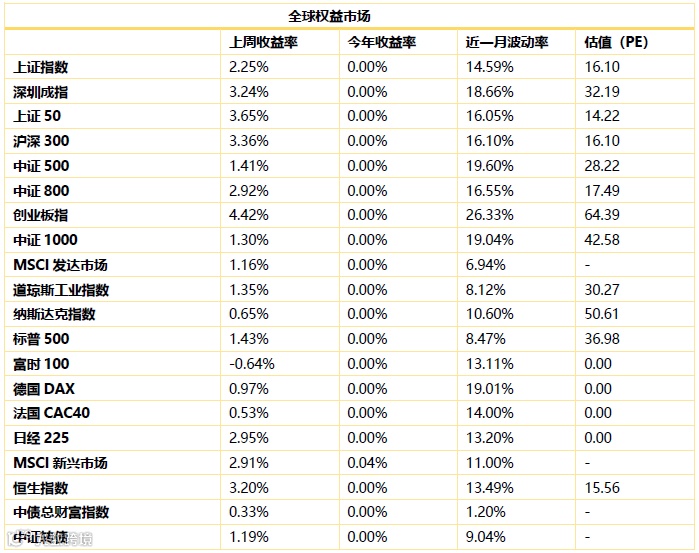 全球市场观察。上周全球主要经济体股市以震荡为主,美国纳斯达克上涨0.65%,标普500上涨1.43%。欧洲主要股市普遍上涨,其中德国DAX上涨0.97%、法国CAC40上涨0.53%,富时100下跌0.64%。亚洲市场,日本日经225指数上涨2.95%,香港恒生指数上涨3.20%。