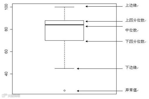 箱盒图共由五个数值点构成,分别是最小观察值(下边缘),25%分位数(Q1),中位数,75%分位数(Q3),最大观察值(上边缘)。