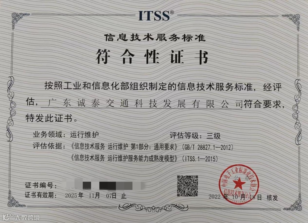 近日,道路研究院诚泰公司顺利取得由中国电子工业标准化技术协会信息技术服务分会颁发的“ITSS 运行维护服务能力成熟度三级”资质。这也是诚泰公司自2019年后再次取得该资质。