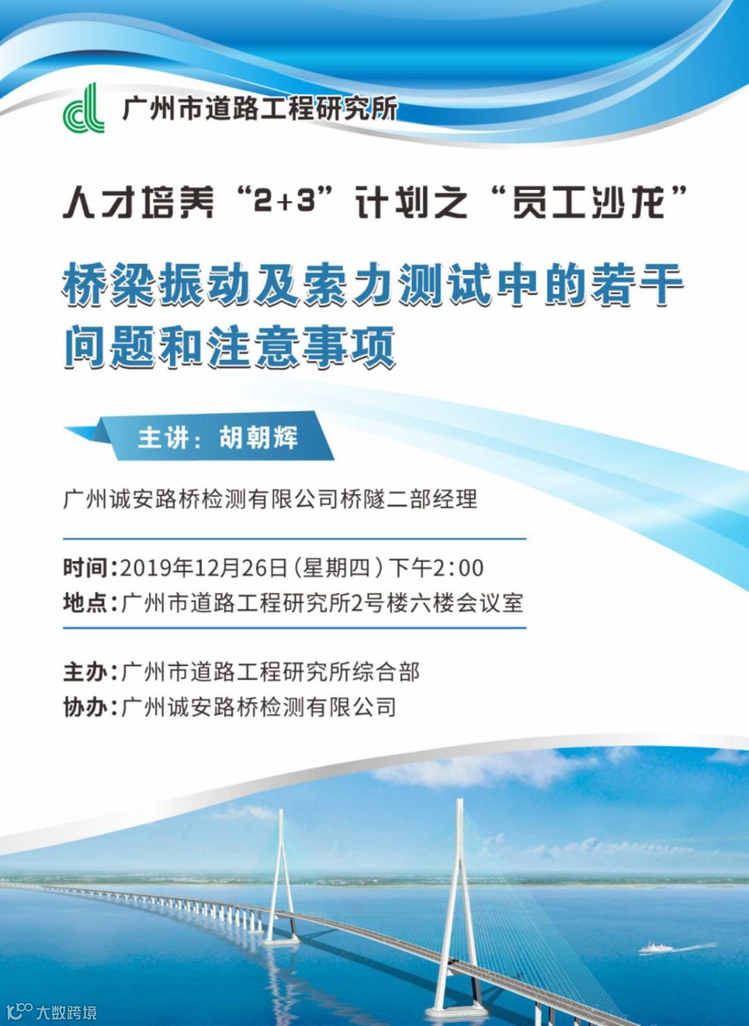 本次沙龙由研究所所属诚安公司路桥高级工程师胡朝辉主讲,主题为《桥梁振动及索力测试中的若干问题和注意事项》。