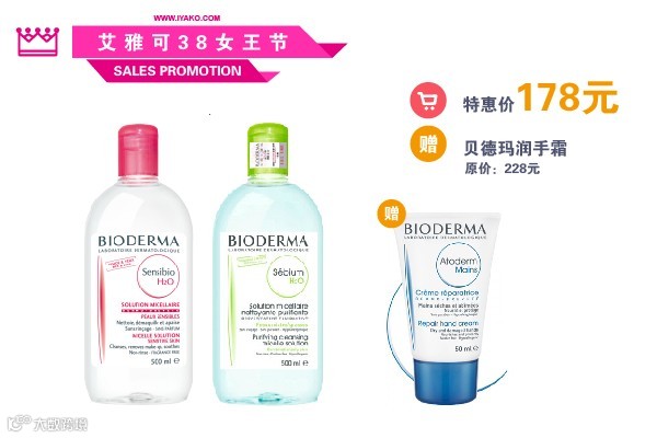 即日起至3月8日,法国三大药妆品牌之一贝德玛洁肤液500ml,特惠178元,加赠贝德玛手霜!