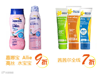 其他防晒:澳洲NO.1户外专业防晒茜茜尔全线7折;嘉娜宝 Allie、高丝、水宝宝9折。