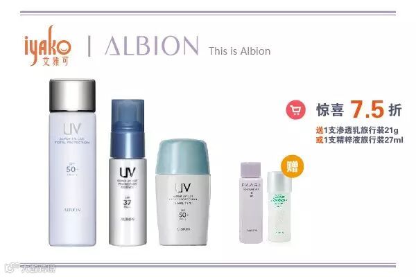 防晒系列产品,惊喜7.5折,再送1支渗透乳旅行装21g或精粹液旅行装27ml哦~