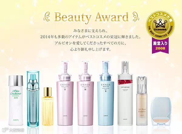 此外,其单品年年入选日本各大美容杂志、年度化妆品大奖,例如澳尔滨渗透乳荣获了100多项化妆品排行榜的冠军乳液,连续8年荣获化妆品界的奥斯卡Cosme大赏乳液排行榜冠军,创造了连续6年囊括冠亚季军的奇迹。而经典产品健康水是日本三大王牌化妆水之一,也曾多次问鼎cosme大赏化妆水冠军。
