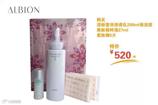 ALBION澳尔滨促销组合1(清新莹润渗透乳200ml保湿型+爽肤精粹液165ml+小样五件套*2)