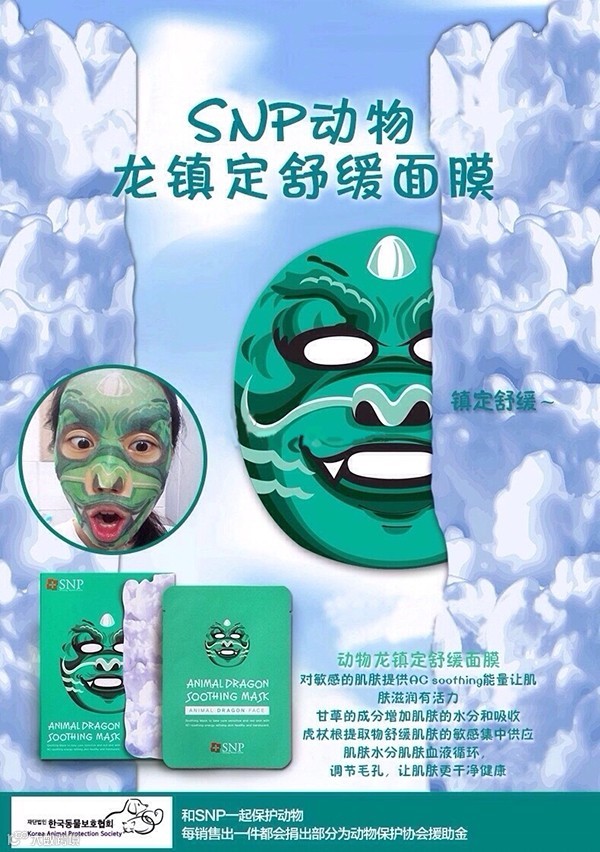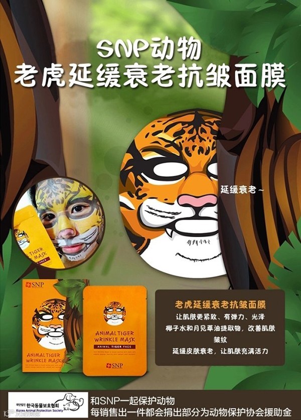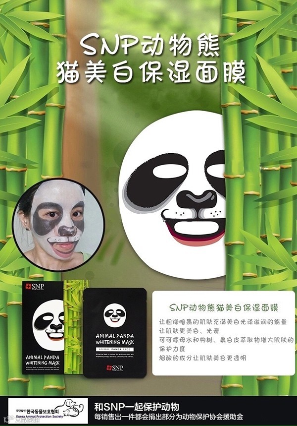 现在,就让小编来揭开它的神秘面纱,来来来,掌声响起来。Duang Duang~这个神奇的面膜就是出自韩国SNP的动物面膜,其中包括可爱的熊猫、威猛的老虎和搞笑的恐龙三个系列。面膜上的动物图案采用水性天然燃料印制而成,安全环保!而且有一种变身动物,深处森林的即视感有木有?面膜采用的是蚕丝材质,天然材料,更透气饱满,护肤搞怪两不误,Just for fun~