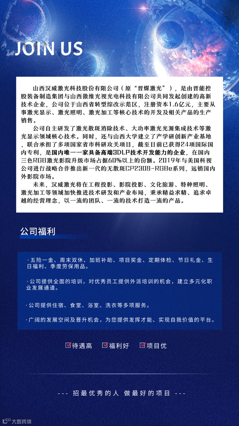 我们汉威激光科技股份有限公司作为山西省优质的高端技术企业,也为每一位优秀的求职意向者提供了非常具有吸引力的就业岗位。