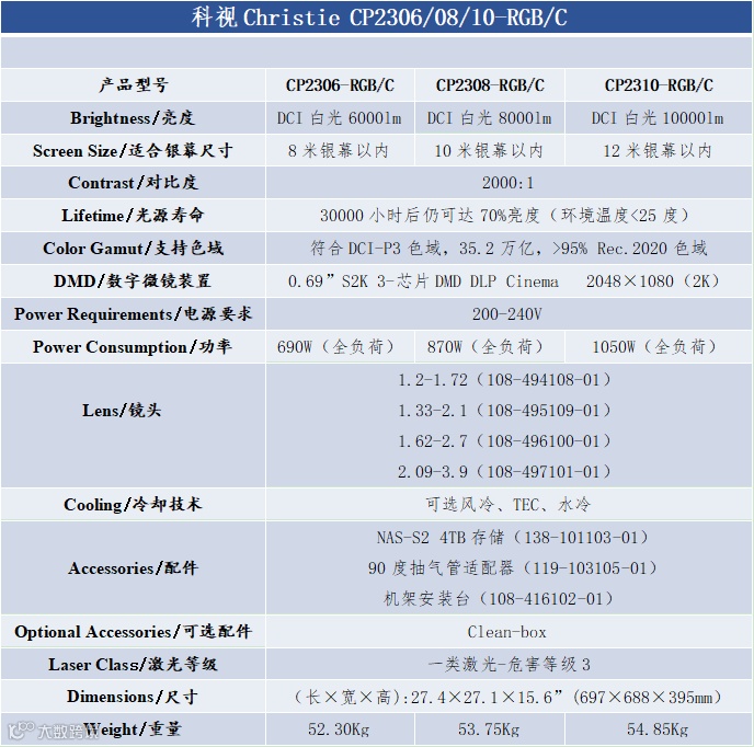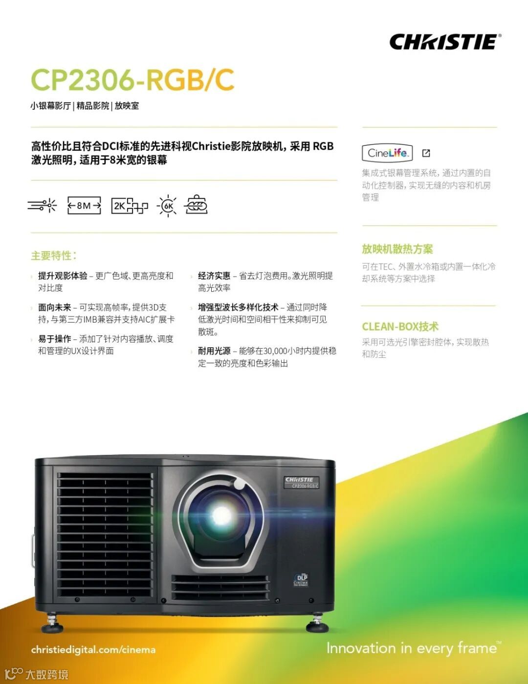 科视Christie CP2306/08/10-RGB/C的宽色域和高亮度,可以提高用户的体验感;其全密封的防尘设计与自检风险预警系统,保障了机器运营的安全性;低耗材,高光学转换率,降低了放映机后期的运营成本,是影院投资者和经营者的理想选择。