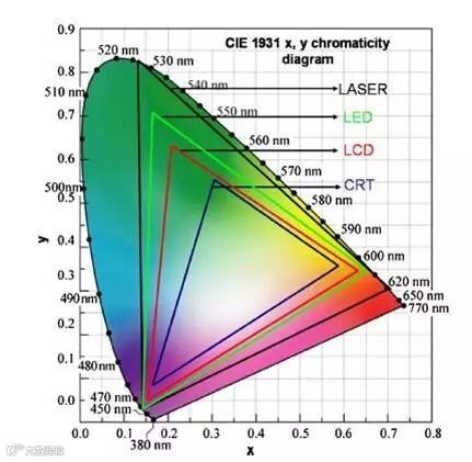 好的色彩将直接带给我们视觉上的震撼,比如《某凡达》中色彩斑斓的画面会让我们记忆良久,那么放映系统中如何量化每种光源所能达到的色彩呢,我们有国际通用的NTSC标准、DCI标准和Rec.2020标准,从下图各类光源色彩覆盖范围可看出,RGB纯激光光源覆盖色域是NTSC标准的2倍、DCI标准的1.57倍,覆盖人眼所见颜色90%以上,达到Rec.2020标准,各类光源对比可以看出RGB三色激光光源才是目前色彩还原的王者。