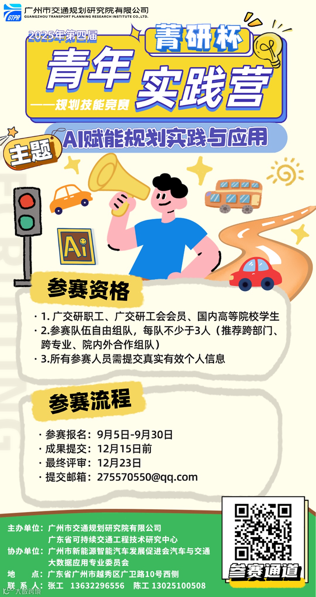 为促进学术交流与技术创新,广州市交通规划研究院有限公司(以下简称“广交研”)工会联合广州市新能源智能汽车发展促进会汽车与交通大数据应用专业委员会,依托“广东省可持续交通工程技术研究中心”、“广州市交通规划研究院有限公司科学技术协会”等科研平台,现面向广交研全体职工及国内高等院校学生举办第四届青年实践营规划技能竞赛。