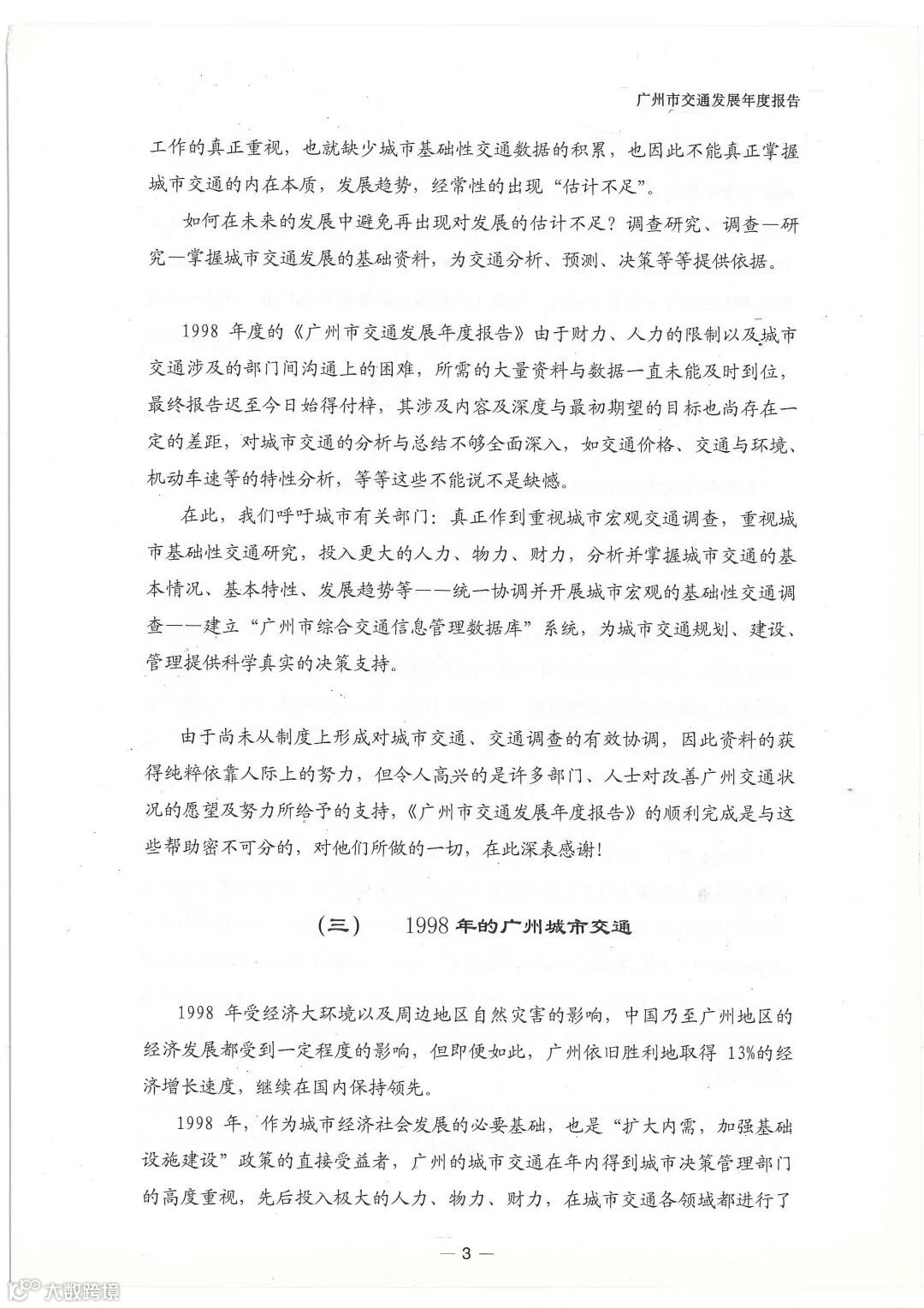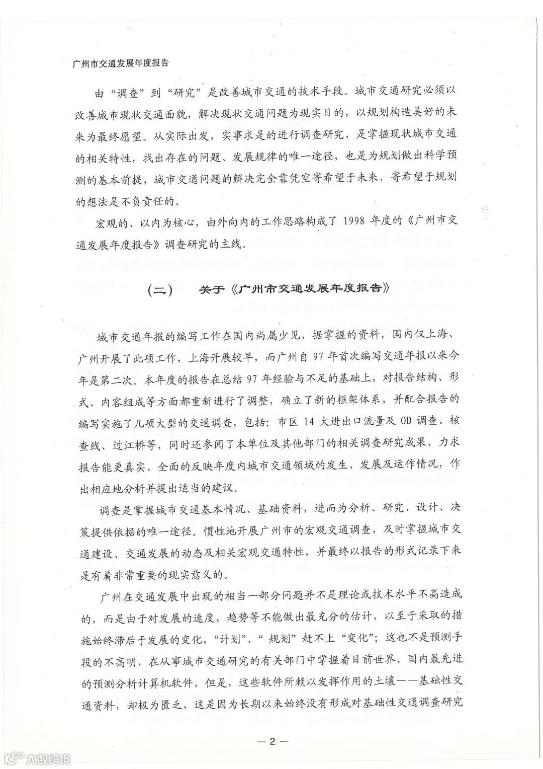 随着城市机动化进程加快,由此引发的城市道路交通拥堵和公共交通服务跟不上等问题日益成为交通难题。这一时期的年报强调由“调查”到“研究”作为改善城市交通的技术手段,受限于当时的调查技术,数据除了部门统计数据以外,主要依靠调查人员发放问卷、现场实测、跟车调查等方式获得出行特征、交通流量和行车速度等数据,基本能满足道路交通供给需求分析的要求。