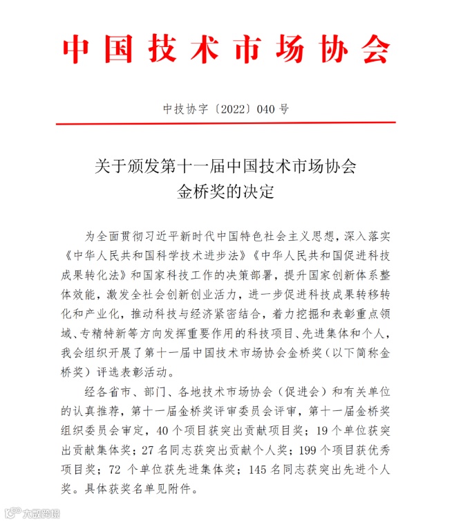 近日,中国技术市场协会发布了《关于颁发第十一届中国技术市场协会金桥奖的公告》(中技协字〔2022〕040号),表彰在我国重点领域、专精特新等方向发挥重要作用的优秀项目、先进集体和个人。我院牵头完成的《城市轨道交通枢纽便捷换乘与应急疏散关键技术集成与应用》荣获优秀项目奖。