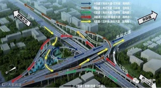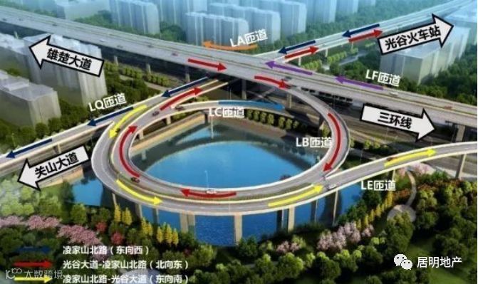 新建两座大型立交,光谷到汉口更便捷。除了南北方向的高架桥,该工程还涉及新建3对上下匝道和2座大型互通立交桥。两座立交分别是与三环线交接处的“光谷大道立交桥”,以及和凌家山北路交接的“凌家山北路立交桥”。