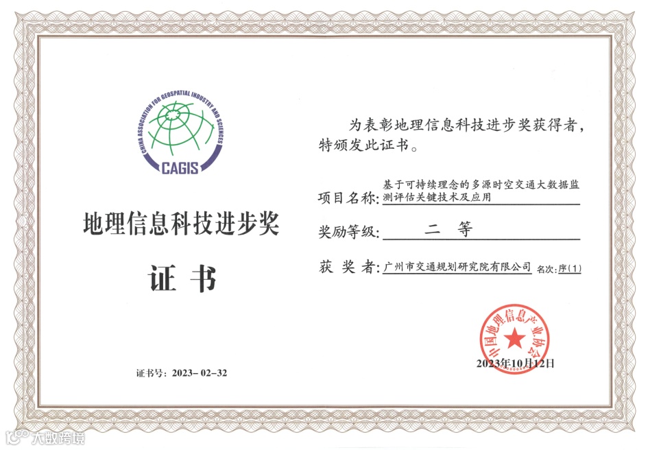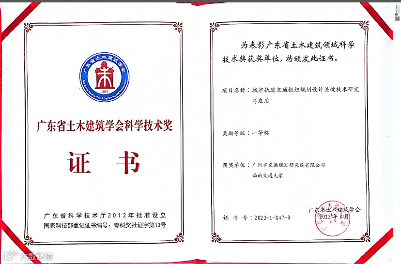 积极提炼和总结科技成果,共计获得科技类奖项12项,其中《城市轨道交通枢纽规划设计关键技术研究与应用》获得广东省土木建筑学会科学技术一等奖,《自然资源资产全要素价值评估核算关键技术研究及应用示范》获得金粤自然资源科学技术一等奖,《基于可持续理念的多源时空交通大教据监测评估关键技术及应用系统》获得中国地理信息科技进步二等奖,《多源海量数据驱动的广州地铁TOD监测评估与优化提升》获得“广东技工”羊城行动—“羊城工匠杯”2023年度TOD综合开发创新大赛一等奖,《面向网络化运营的城市轨道交通规划设计关键技术研究及应用》获得广东省工程勘察设计行业协会科学技术二等奖,《面向自动驾驶的路侧交通设施需求及设置方法研究》获得广东省智能交通优秀项目案例二等奖,全年累计获奖种类、数量、等级均创历史新高。