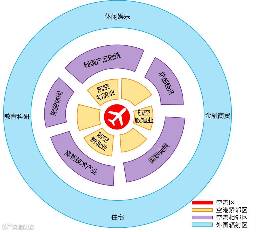 (4)临空引至产业:指由机场的可达性、核心和关联产业客货流吸引,以满足各类人员生活和服务需求为目的而在机场周边布局的产业,如休闲娱乐、住宅、教育科研、金融、商贸等。