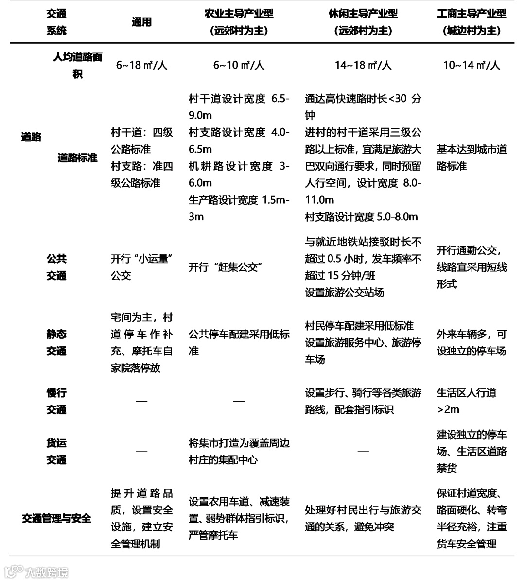 超大型城市的各类村庄差异明显,基于产业类型分为农业主导产业村、休闲主导产业村、工商主导产业村和综合产业村,分别确定交通规划要点与设施指标(见表2,综合产业村按其涉及的产业类型参照确定)。