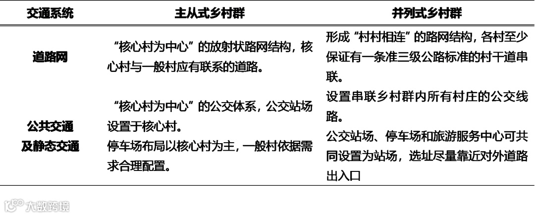 根据空间结构、经济发展、组织管理等关系,将乡村群分为主从式、并列式和互补式,其中后两者交通特性近似,乡村群交通规划主要针对主从式、并列式。
