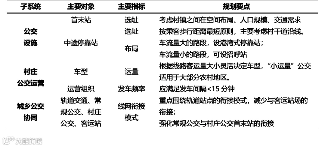 村庄公交系统不仅应考虑公交首末站、公交线路在本村的设置,还应在片区层面考虑与城市轨道及交通、常规公交的协同(见表3)。