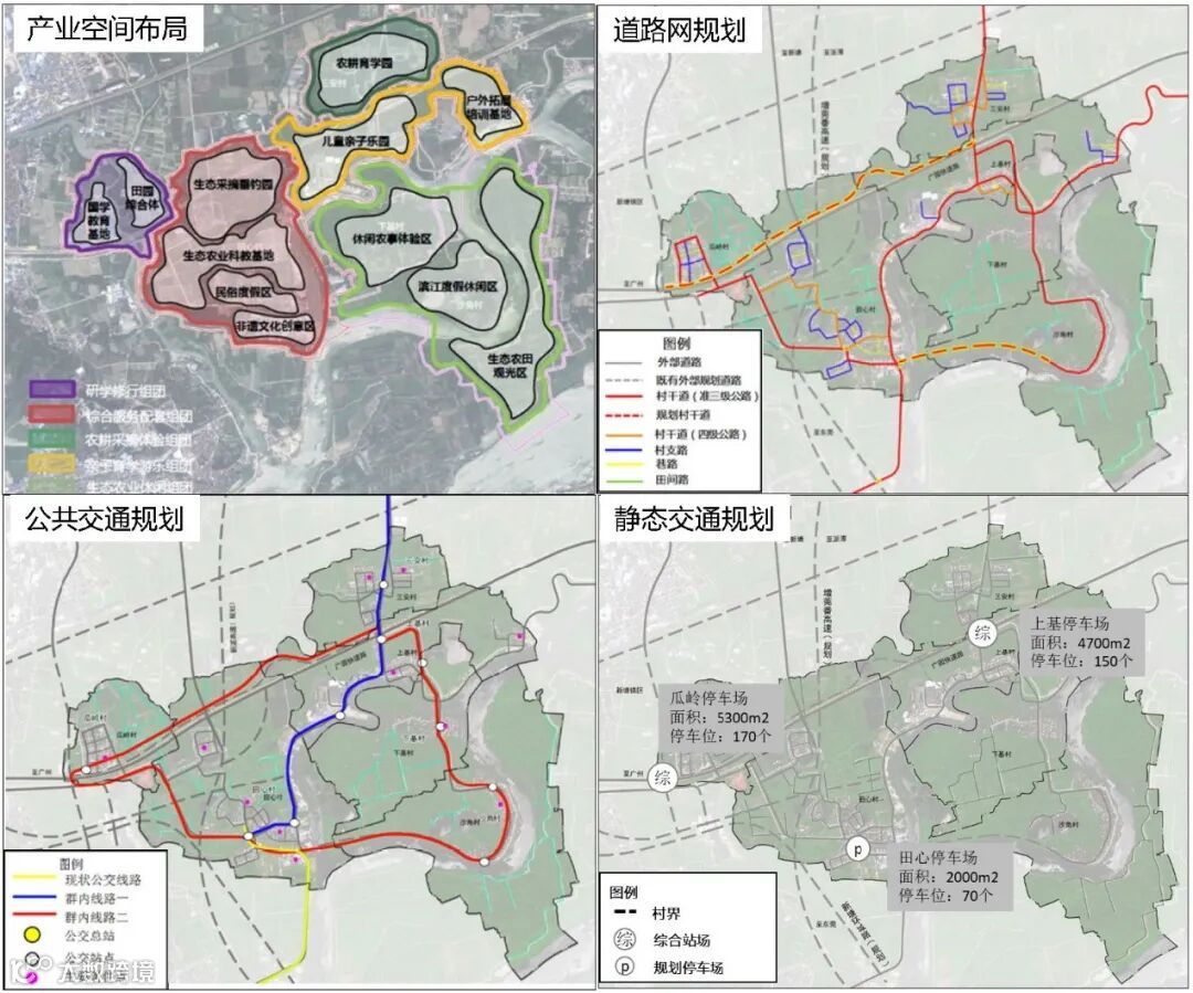 交通规划方案包括:新增2条、改造3条村干道,形成“一纵、一环、多分支”路网结构,有效支撑乡村群的并列式发展;规划形成“地铁接驳线+镇区慢线+群内短线”公交体系,加强瓜岭乡村群与地铁13号线新沙站的联系并使群内各村间有公交线路相连;结合对外出入口设置2处综合停车场,在田心村设置村民停车场;结合滨河路和机耕路设置休闲绿道,在途经乡村群的东江设置水上休闲游线。