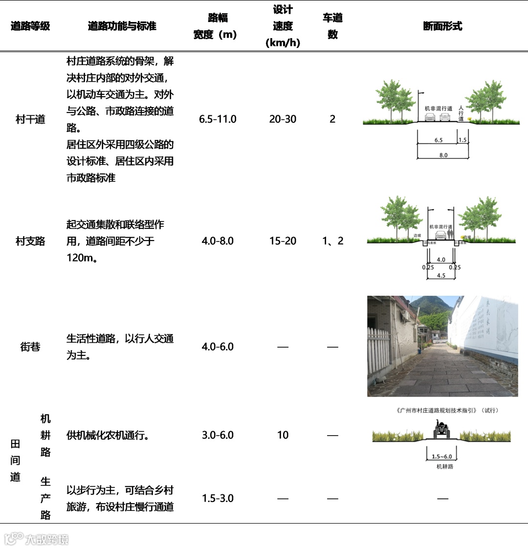 道路系统是村庄交通规划的核心,广州将村庄道路划分为村干道、村支路、街巷和田间道四个等级(见表1),形成《广州市村庄道路规划技术指引》并已印发实施。