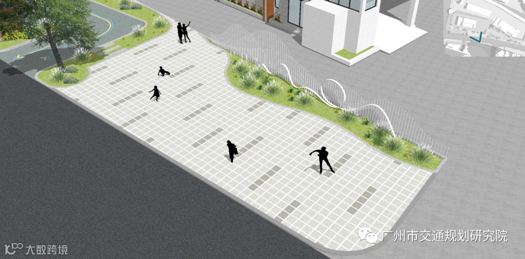 利用原被围栏分隔的边角地辟建供家长休憩的空间、学生的活动场地、周边居民孩童的休闲空间,取代原有的消极空间气息。在满足功能空间营造的同时,融合现代社区的活力与小学生的活泼好动,在场地设计中赋予轻松明快的色彩主题,同时增加色彩鲜艳的主题标识,提升街景的可识别性与美观性,激发城市活力。