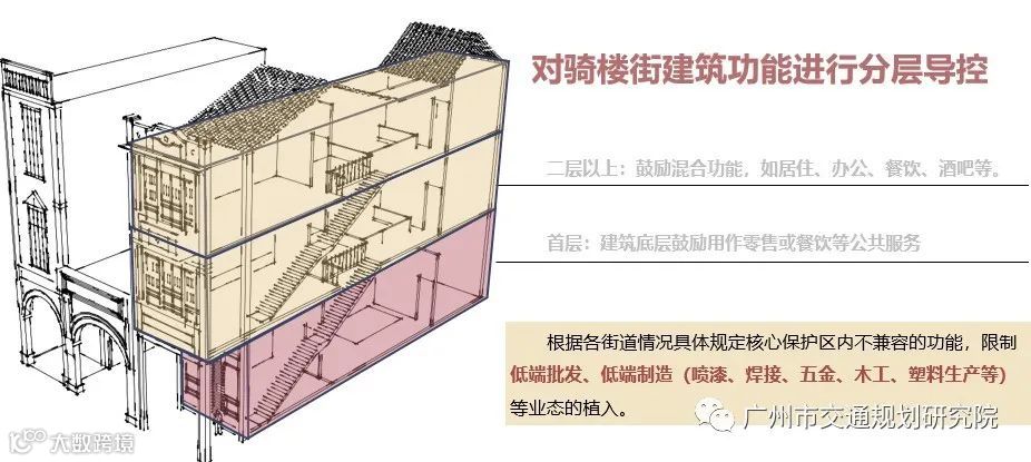 (4)创新性提出基于三维空间的保护利用指引。创新性的在历史保护中运用城市设计的三维研究手法,从三维空间的角度对骑楼街保护研究,提出建筑功能分层控制、骑楼建筑立面分段导控、骑楼街功能活化等精准化精细化指引。