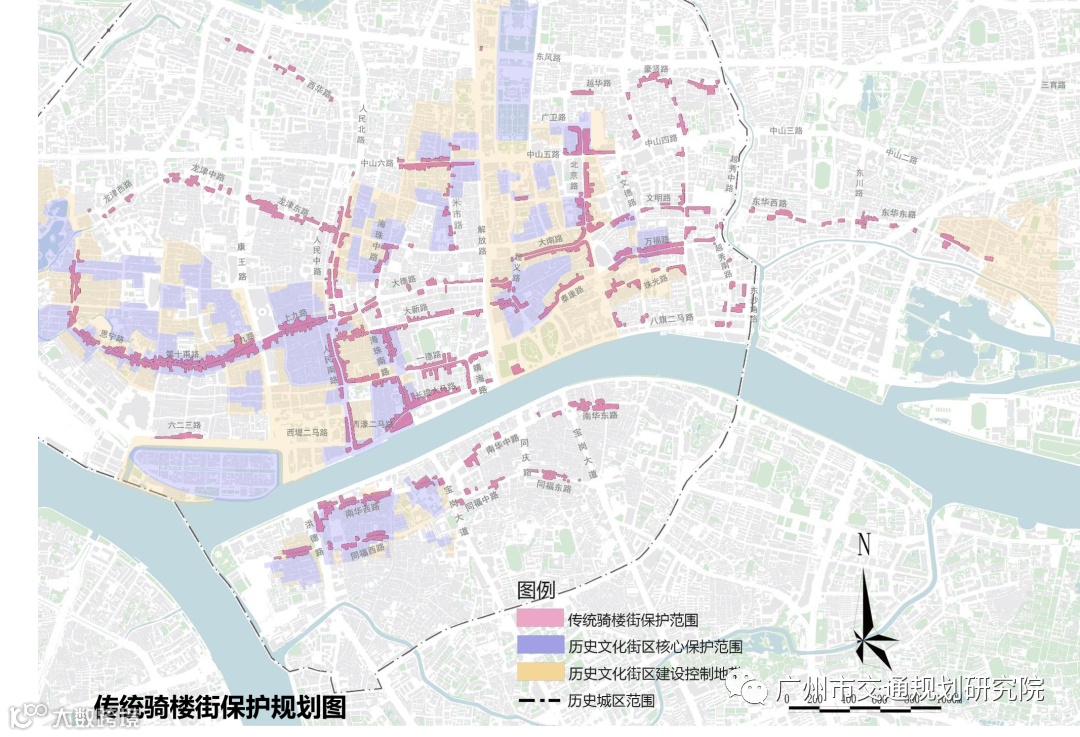 传统骑楼街是广州历史发展中重要的文化遗产,具有不可复制的历史价值、文化价值及实用价值。广州市内曾建成骑楼街长度几近40公里,由于骑楼街的保护尚未上升至法律层面,现状近五成传统骑楼建筑未列入法定保护范围,并缺乏专门针对骑楼街的保护与利用指引,保护形势不容乐观。为彰显广州历史名城风貌,实现“老城市,新活力”的要求,广州市规划和自然资源局组织编制《广州市骑楼街保护利用规划》。规划划定60条道路共100个路段作为骑楼街规划保护利用范围。