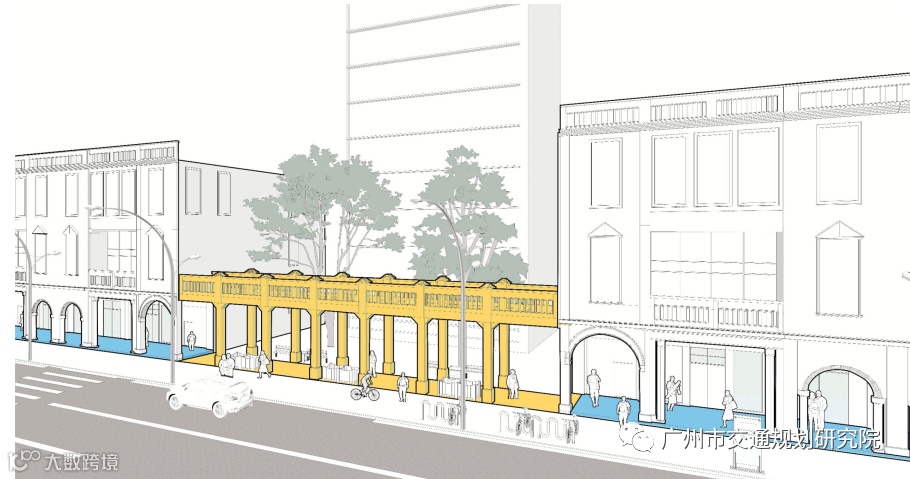 (3)通过特色风雨连廊留存与还原连续骑楼街空间。为了提升以人为本的步行空间,采用玻璃飘廊、仿古柱廊等方式连接步行空间,形成连续、舒适的高品质骑楼街步行空间。