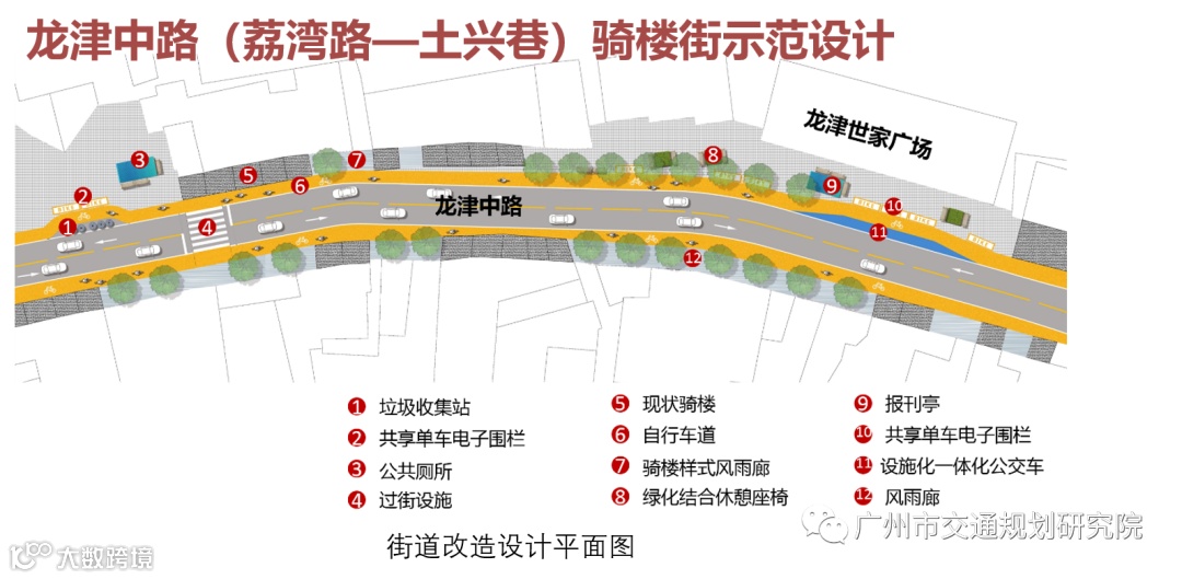 精细化设计街道空间,提升骑楼街通行能力与品质,以龙津中路(荔湾路—土兴巷)骑楼街改造为案例。