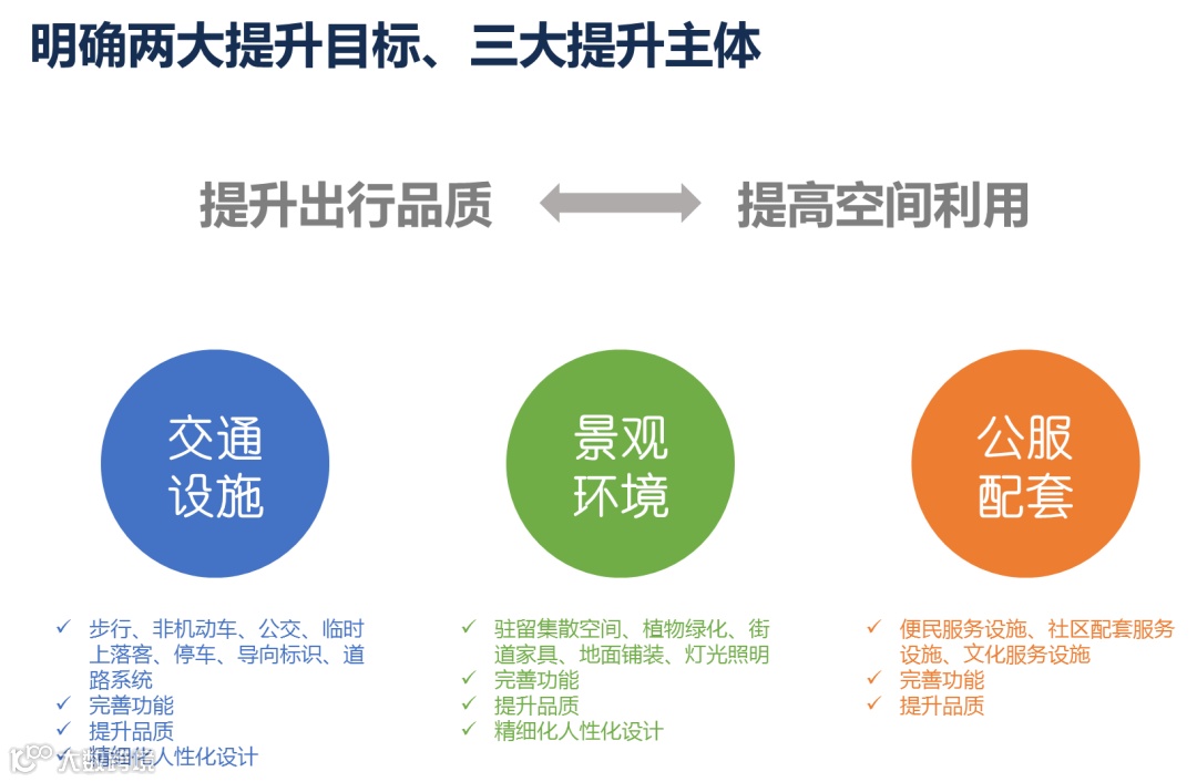 其次,基于用地条件及站点类型,提出品质提升策略。从交通、景观、公服三大设施空间的维度,系统梳理并编制了覆盖步行设施、非机动车设施、公交设施等7大交通设施的设计细则,形成配置、设计、监管三大体系的指引体系。同时,对地铁站点周边的景观环境、公服配套两大缺失的模块进行了升级改造,双管齐下,结合交通设施,三位一体,全方位实现老城区城市功能的升级。