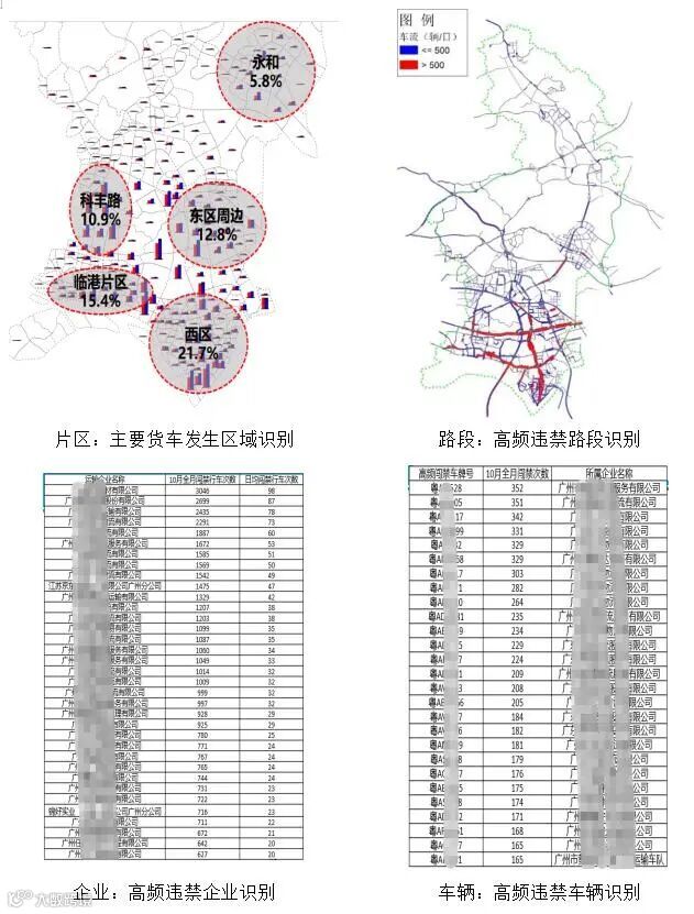 以重载货车GPS数据为基础,进行数据识别与处理,形成了片区、路段、企业、司机四维度的货车违禁治理体系。片区方面,通过宏观模型识别重点货车发生源及区域,强化区域监控;路段层面,识别重点违禁路段和时段,支撑现场执法的精准性;企业方面,识别月度违禁重点企业,强化企业监管;司机方面识别月度违禁多的司机,强化警示教育。
