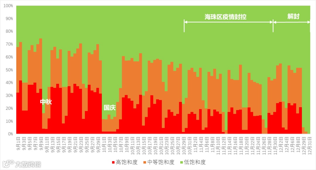 基于交通治理模型系统,利用采集数据,分析了黄埔区工作日和非工作日车流的典型分布特征,从重大节假日与工作日数据对比分析交通设施对短时突发车流的适应性;分析了2022年9月-12月全区月均车流变化情况,从高饱和度路口占比等指标评价路网总体运作状态变化;识别大流量与高饱和度路口的位置,用于支撑精细化交通管控措施制定。季报的编制加强了道路交通感知数据的利用,提升模型应用深度与广度。