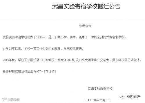 近日,武昌实验寄宿学校发出搬迁公告,正式将教学地址搬迁至长江新城汉口北大道202号,汉口北大道黄湾公交站旁。原东湖校区正式取消。